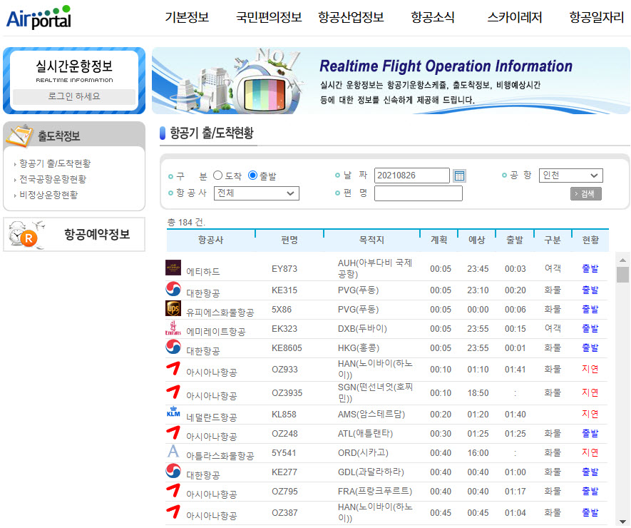 항공정보포털 홈페이지에서 인천공항 비행기 결항정보 확인하기